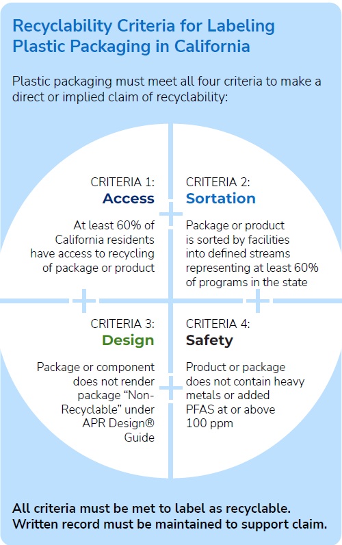 Hoa Kỳ là thị trường không có luật liên bang dành cho bao bì, mỗi tiểu bang sẽ có những quy định riêng phù hợp với hạ tầng địa phương. Gần đây nhất, bang California đã ban hành chính thức SB 343 quy định rõ về việc cấm sử dụng biểu tượng tam giác mũi tên ngụ ý có thể tái chế hoặc các tuyên bố “recyclable” trên bao bì được bán vào thị trường California. Biểu tượng tam giác mũi tên hoặc những tuyên bố này chỉ được dùng trong trường hợp bao bì đáp ứng được những yêu cầu cụ thể về việc thu gom, phân loại, thiết kế và tính an toàn.